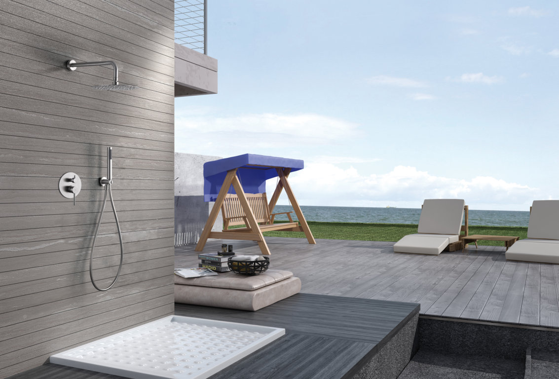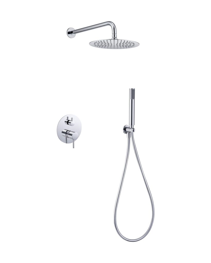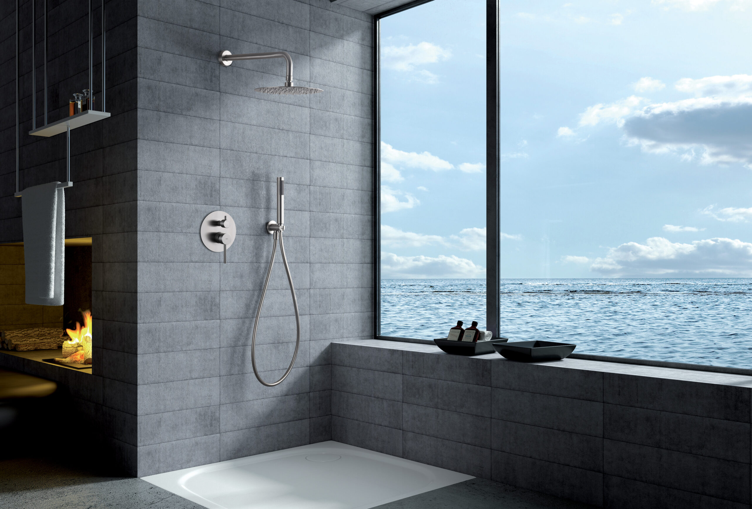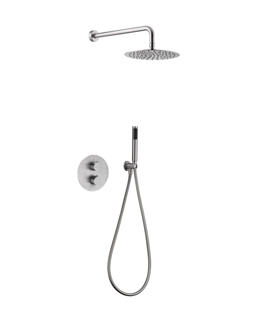 Empotrado de ducha serie MOSCU en acero s.,316, cuerpo de griferia 2 vías, rociador Ø25cm en acero s.316, cartucho monomando 35mm, brazo a pared en acero s.316, salida de agua en acero s.316 con flexo PVC y mango todo en acabado a juego. VALIDO PARA EXTERIOR