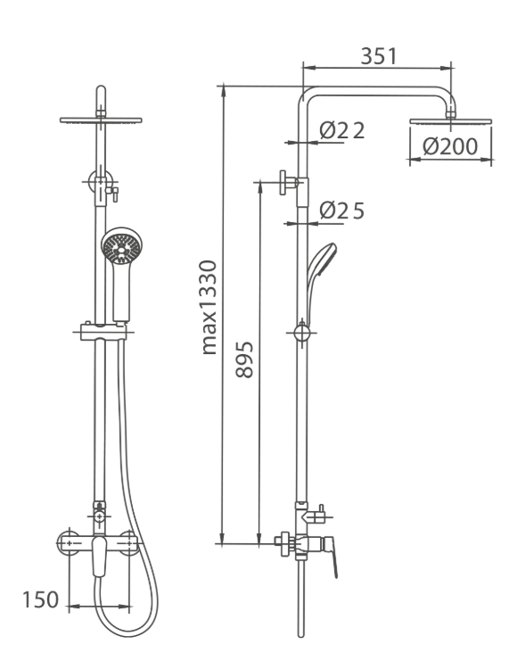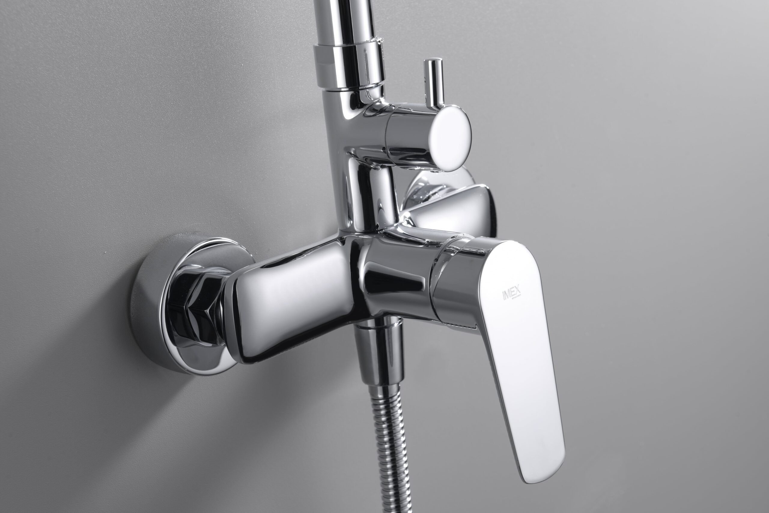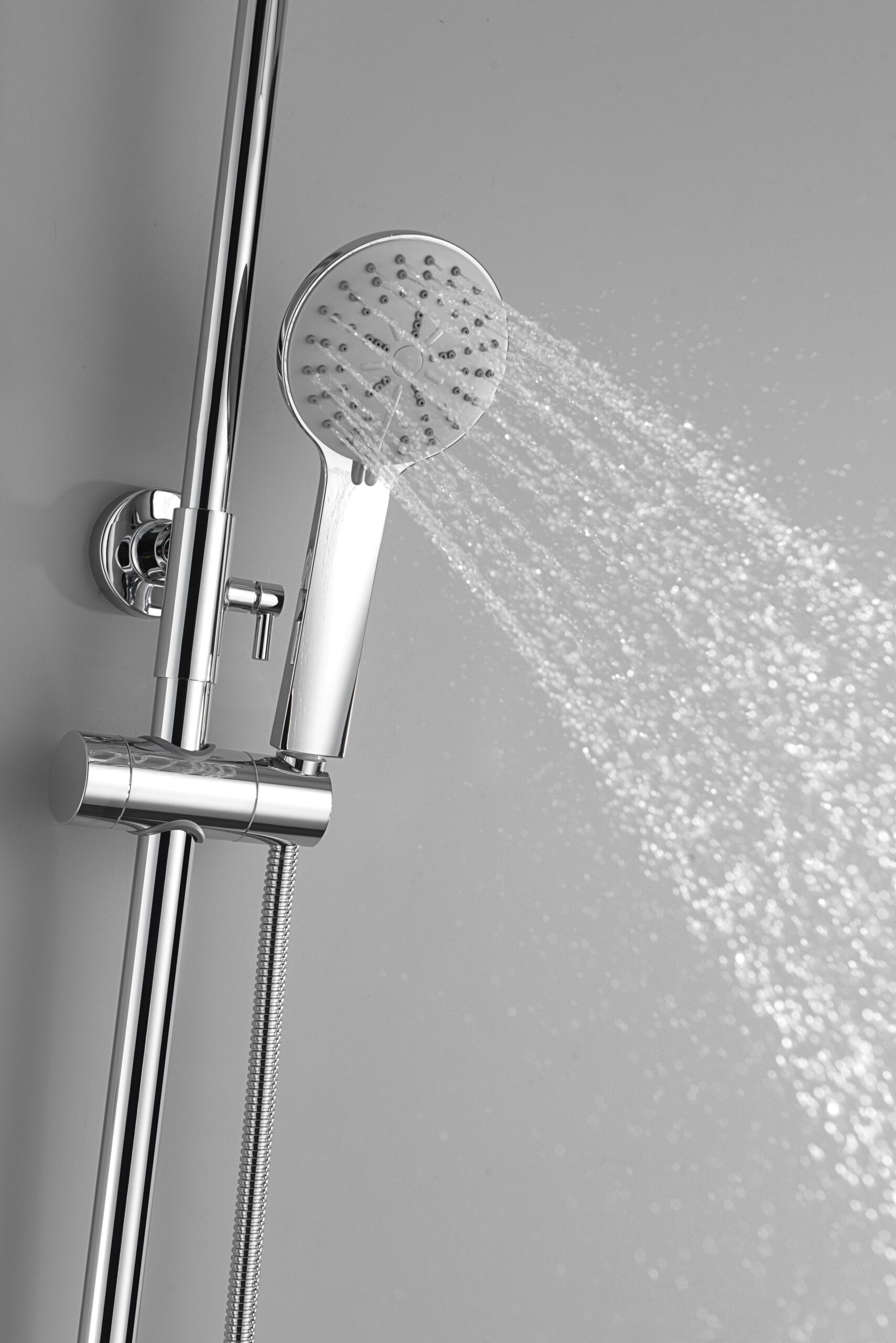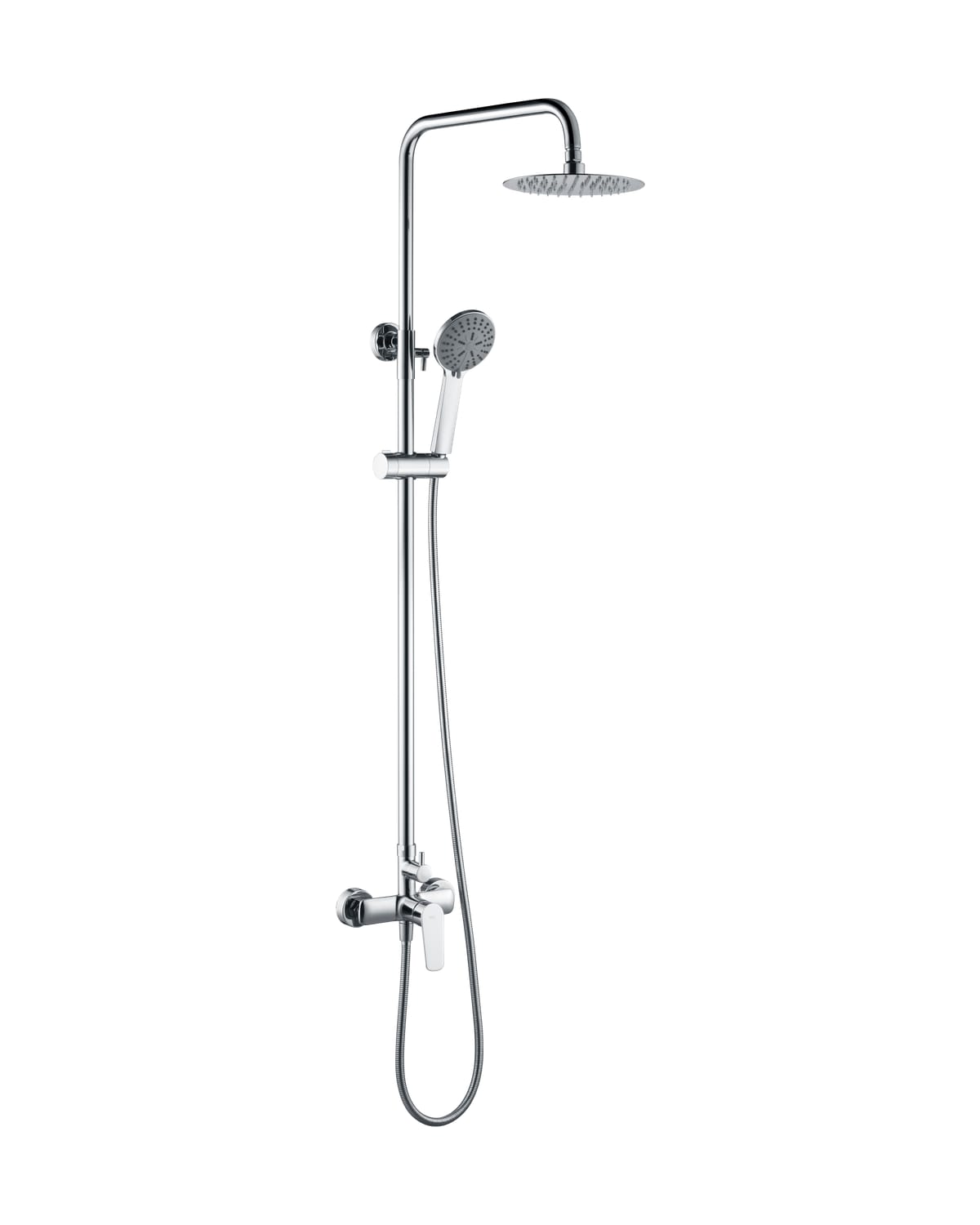 Conjunto de ducha monomando serie BELGICA en acabado cromado, barra de ducha extensible, cuerpo de la griferia de latón cromado, rociador extraplano Ø20 y antical, cartucho cerámico Ø35mm, incluye flexo y mango.