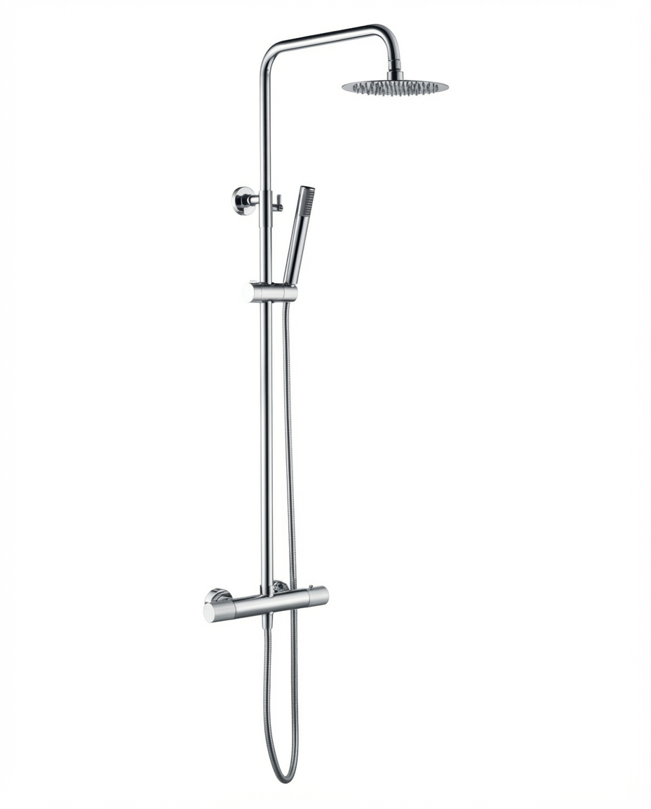 Conjunto de ducha termostático serie LINE en acabado cromado, barra de ducha extensible, cuerpo de la griferia de latón cromado, rociador extraplano Ø20 y antical, cartucho TURN CLEAN SYSTEM, incluye flexo y mango.