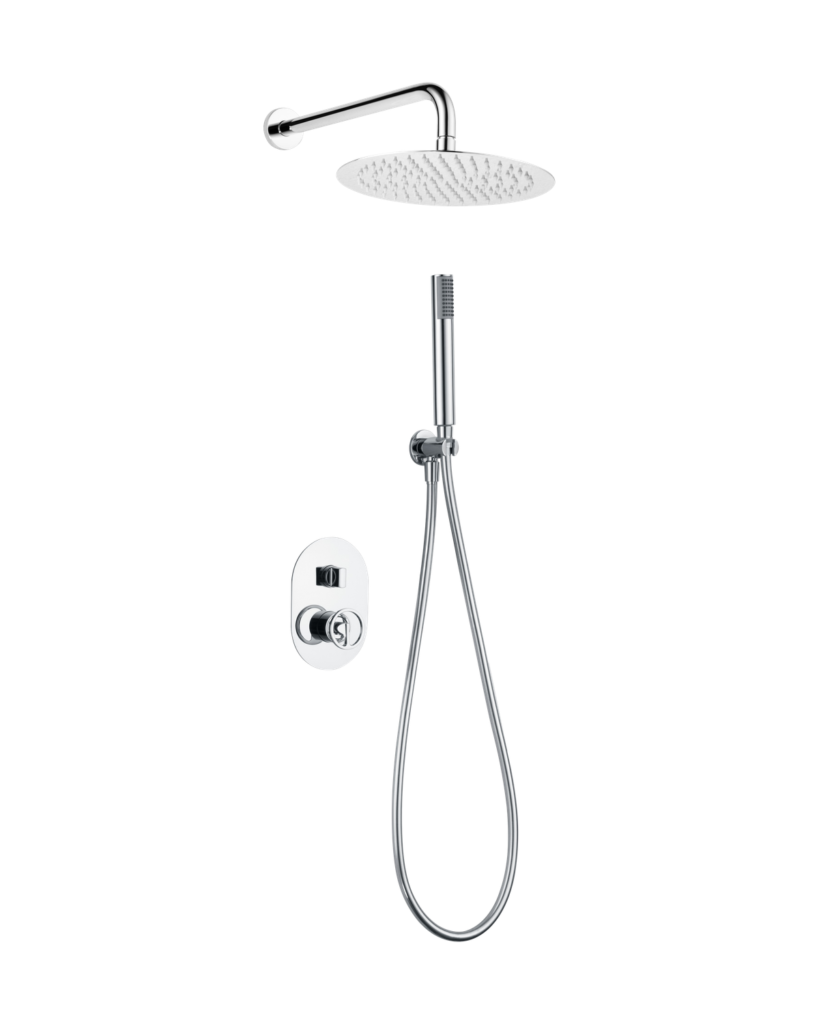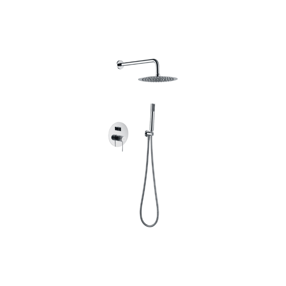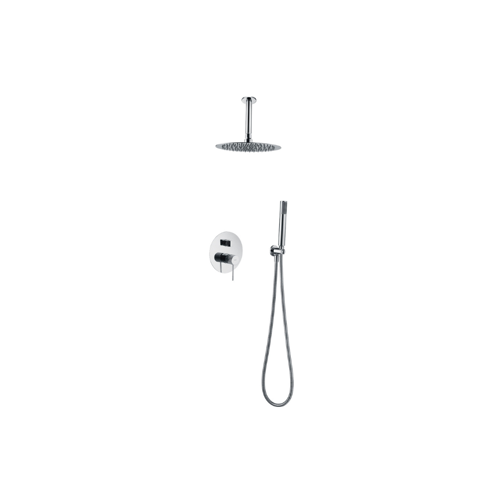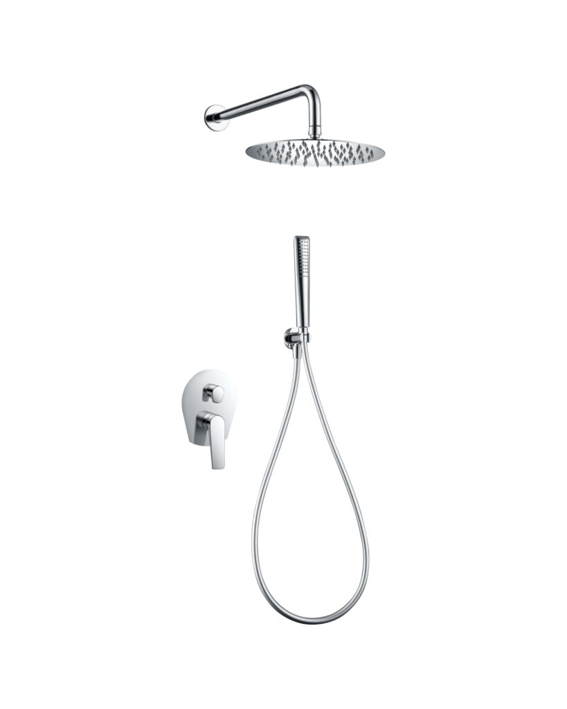 Empotrado de ducha serie VESUBIO, cuerpo de griferia 2 vías, rociador Ø25, cartucho monomando Ø35mm, salida de agua con flexo PVC, mango y brazo a techo todo en acabado cromo.