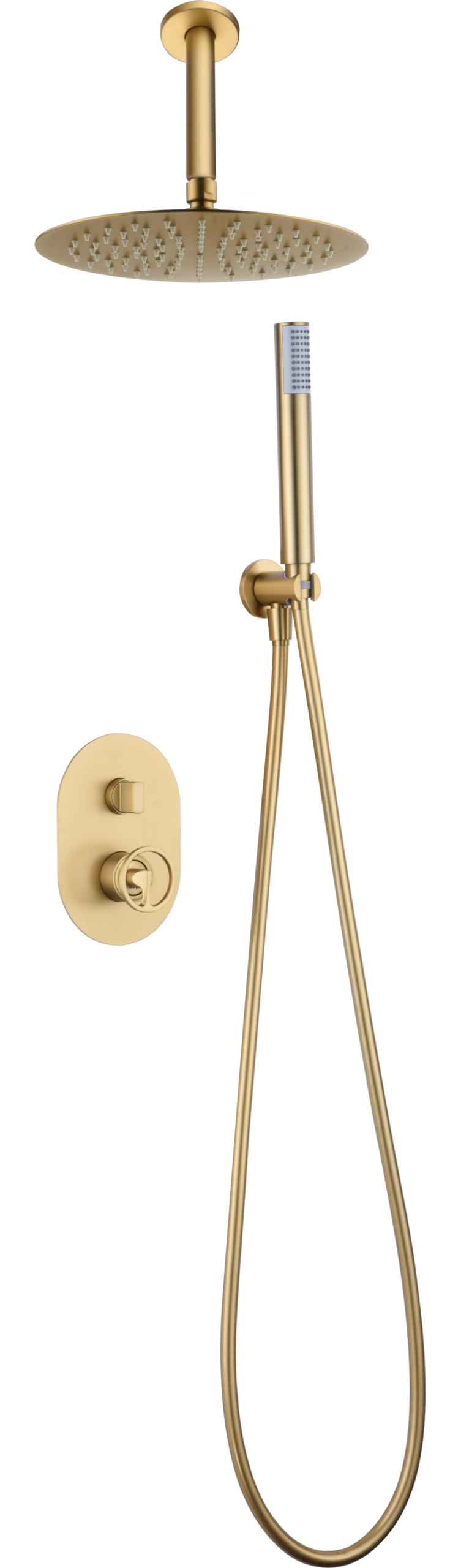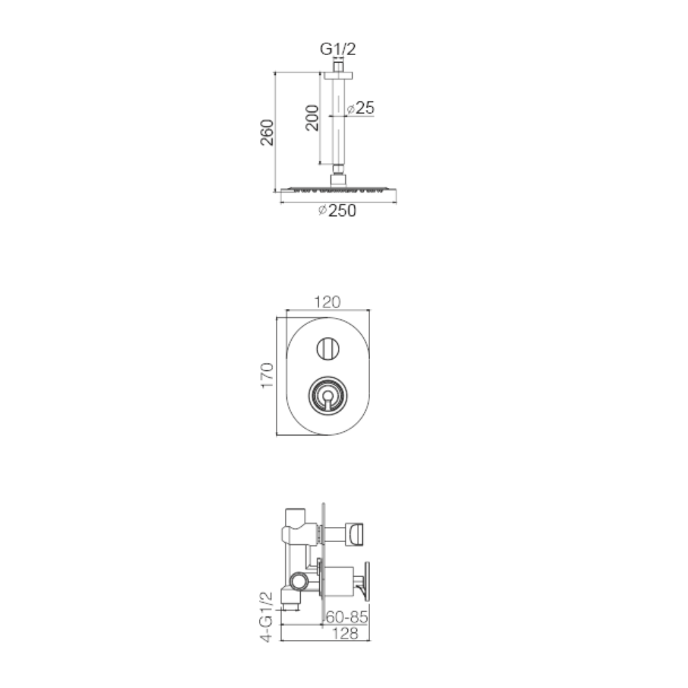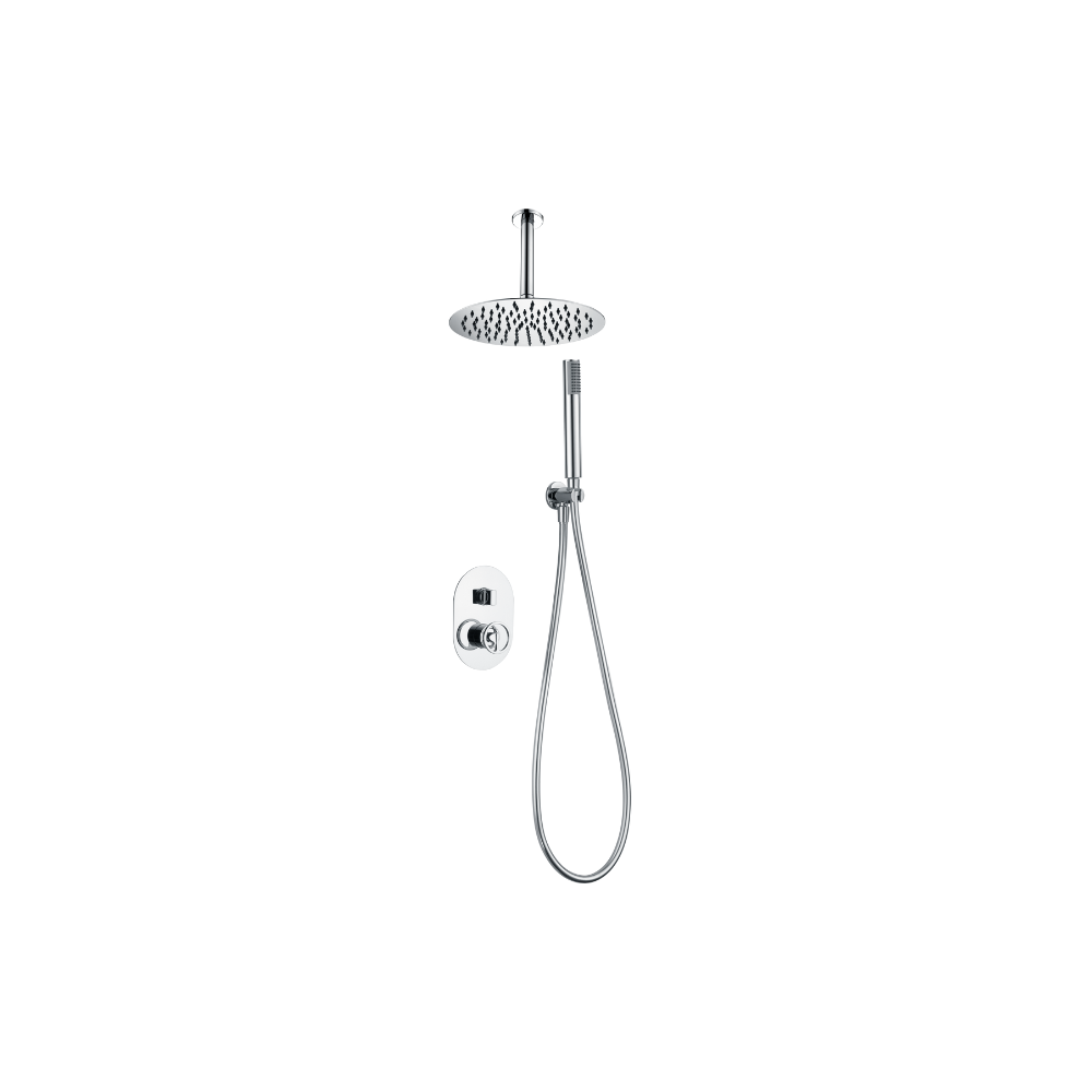 Empotrado de ducha serie VESUBIO, cuerpo de griferia 2 vías, rociador Ø25, cartucho monomando Ø35mm, salida de agua con flexo PVC, mango y brazo a techo todo en acabado cromo.