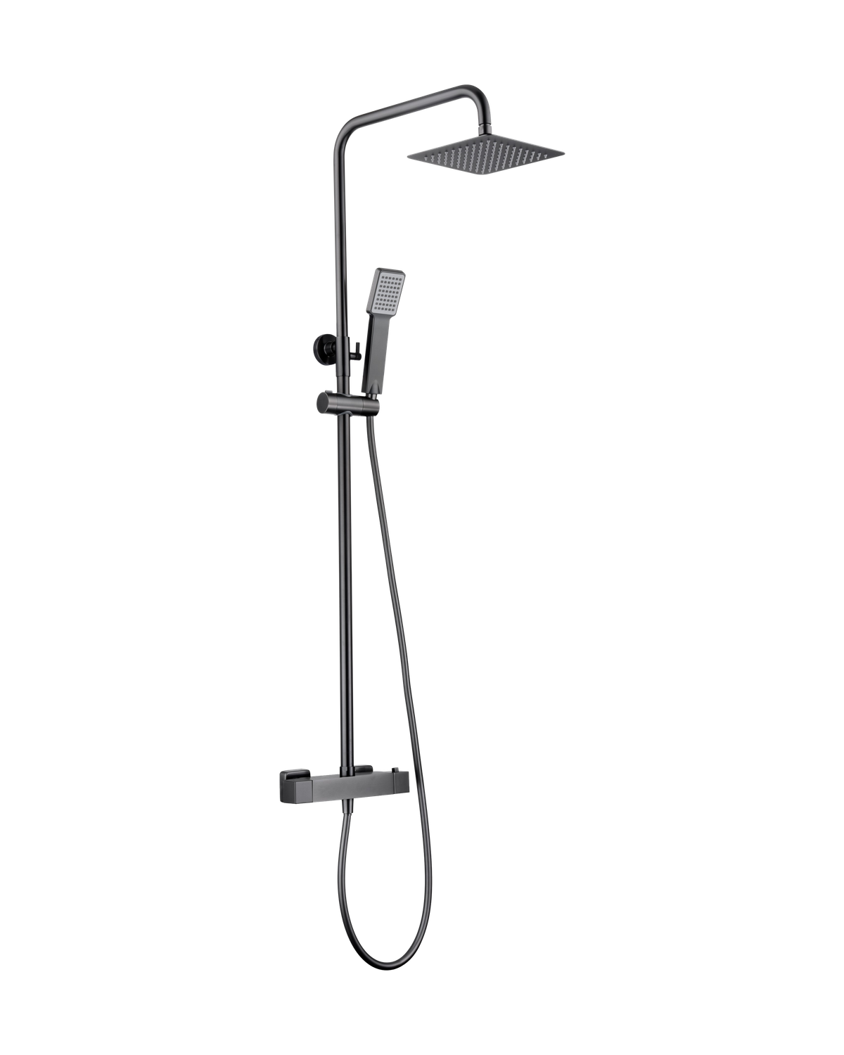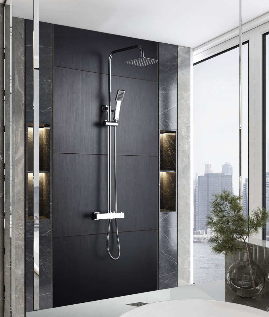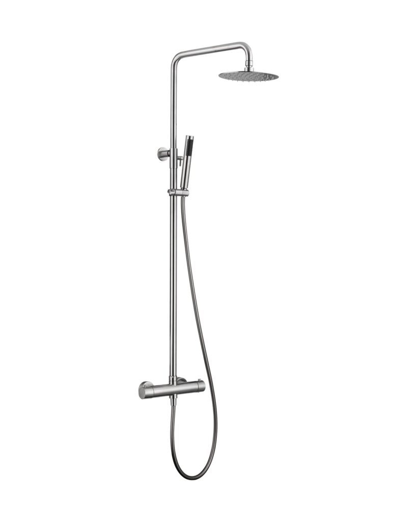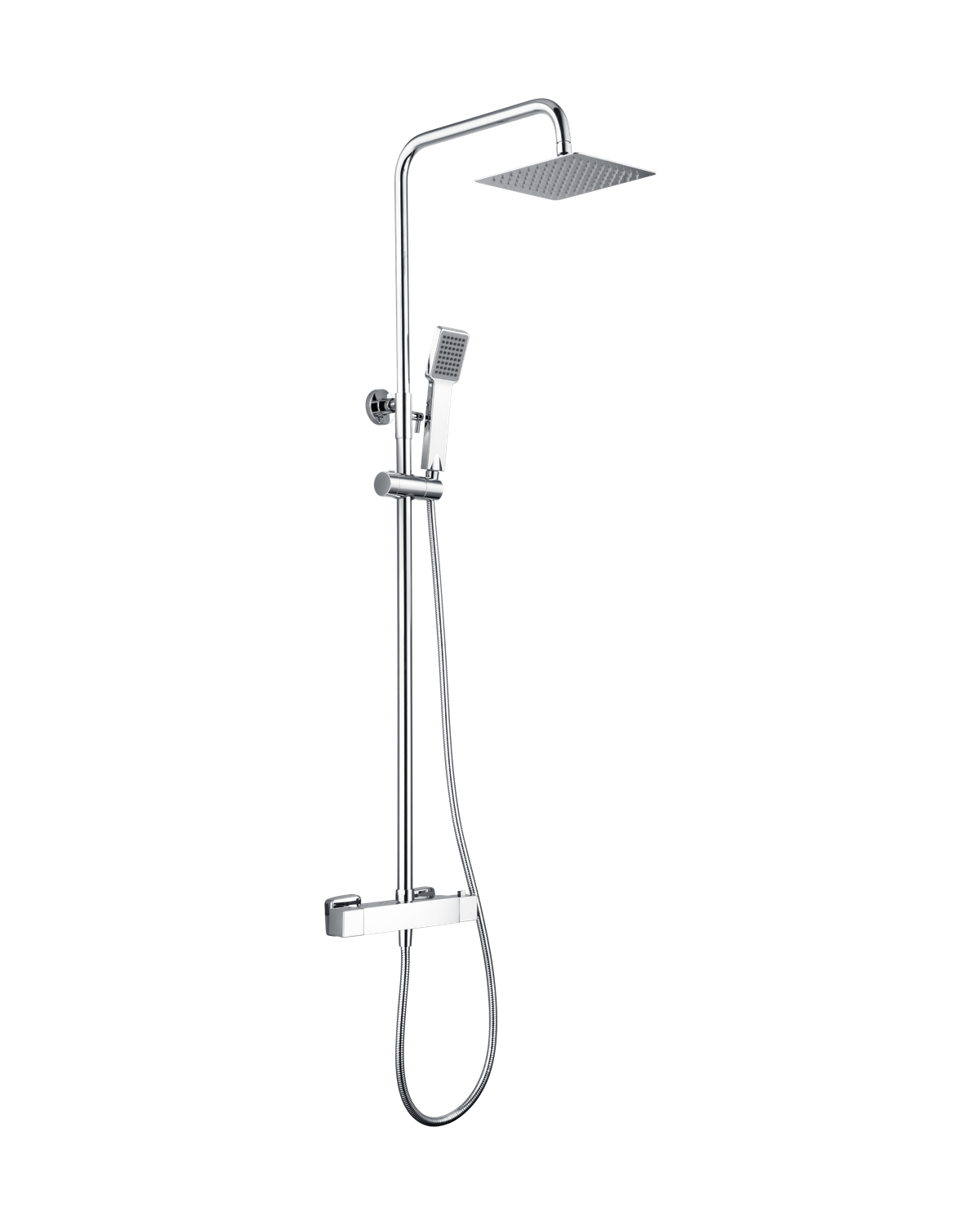 Conjunto de ducha termostático serie ART, barra de ducha extensible, cuerpo de la griferia de latón, rociador extraplano Ø20 y antical, cartucho TURN CLEAN SYSTEM, incluye flexo y mango. Acabado cromo.