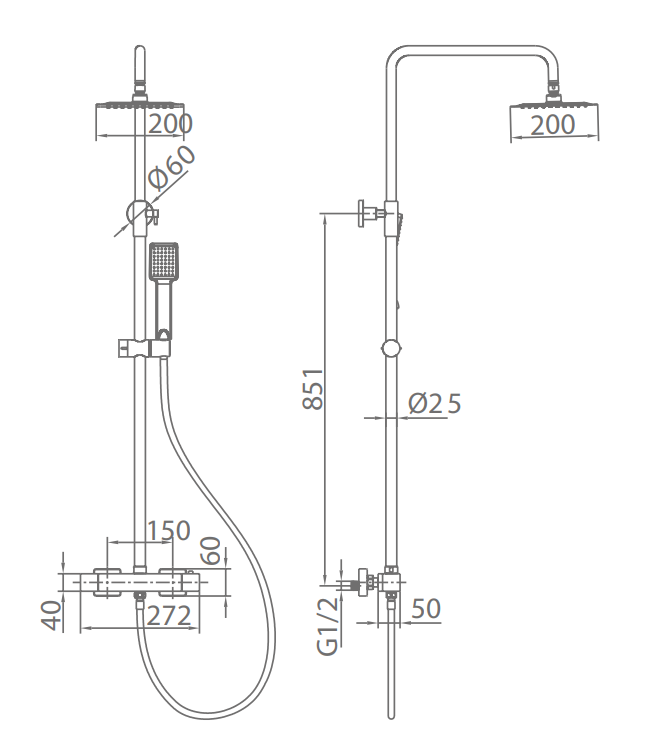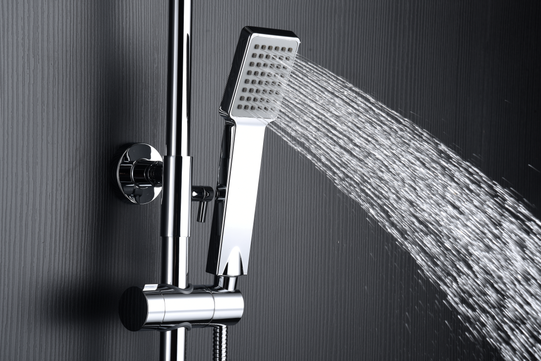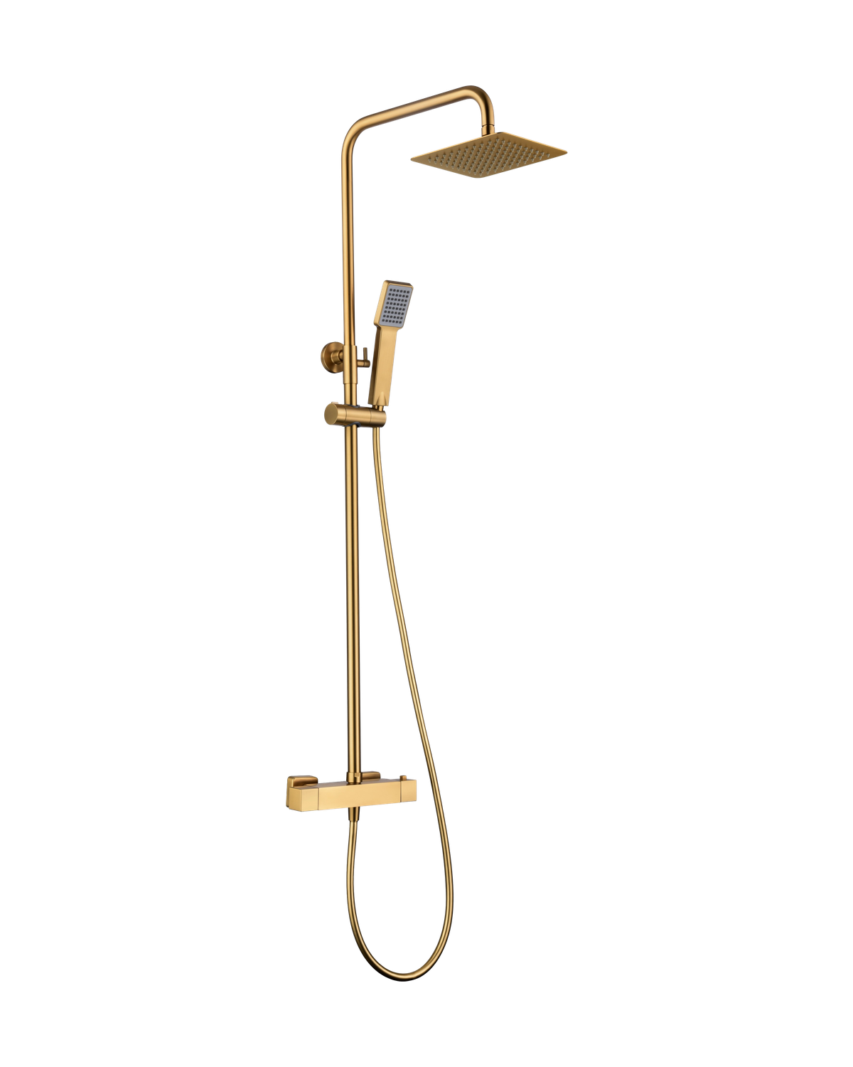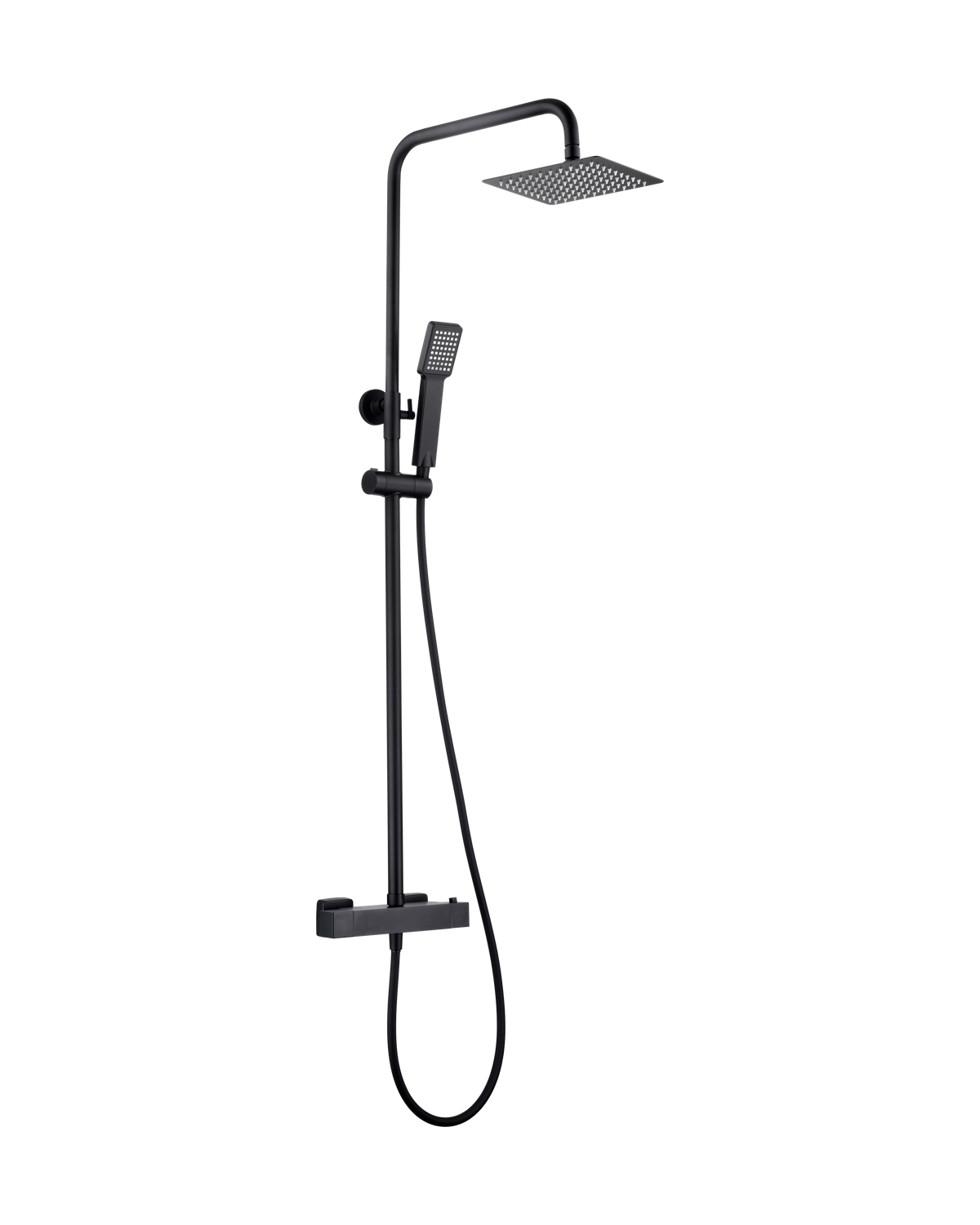 Conjunto de ducha termostático serie ART, barra de ducha extensible, cuerpo de la griferia de latón, rociador extraplano Ø20 y antical, cartucho TURN CLEAN SYSTEM, incluye flexo y mango. Acabado cromo.