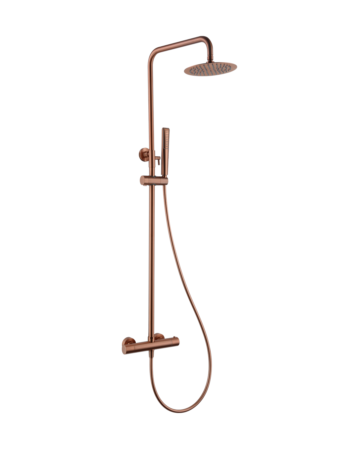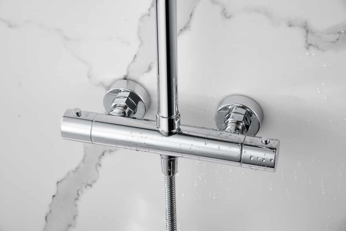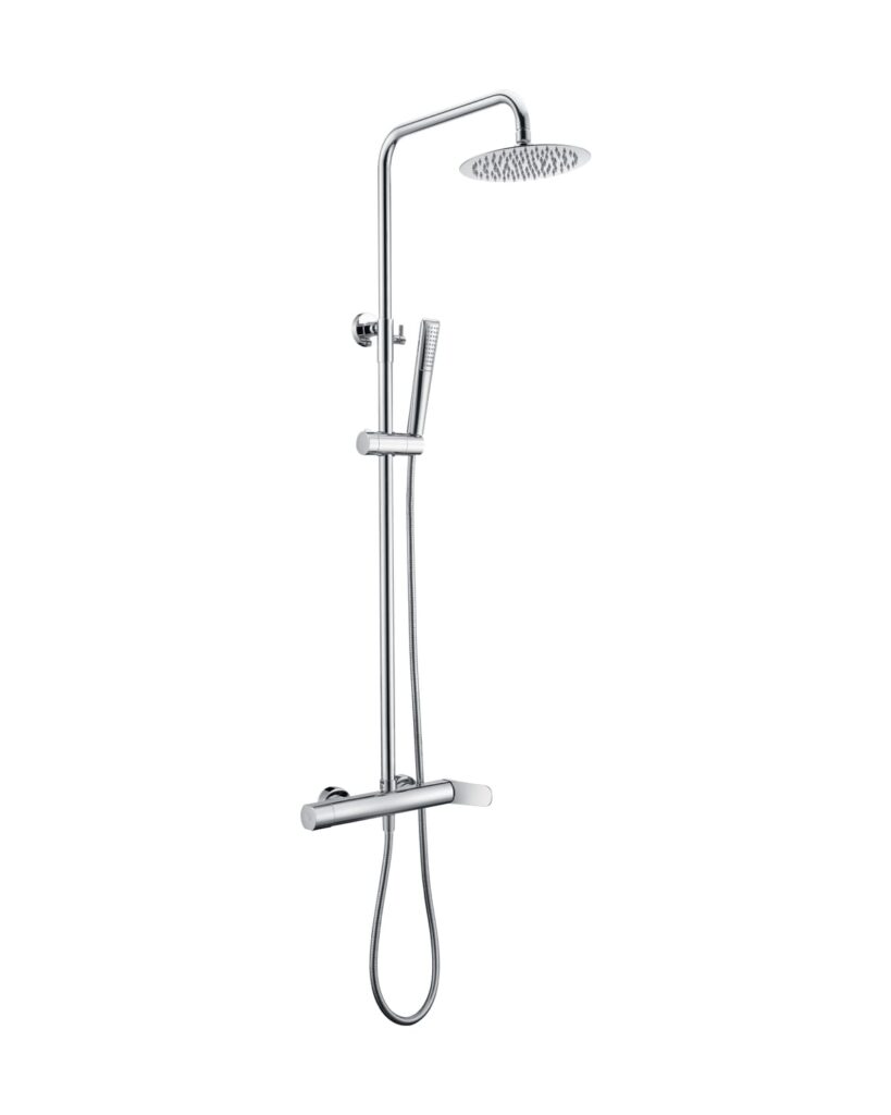 Conjunto de ducha termostático serie NAPOLES, barra de ducha extensible, cuerpo de la griferia de latón, rociador extraplano Ø20 y antical, cartucho termostático TURN CLEAN SYSTEM, incluye flexo y mango. Acabado cromo.