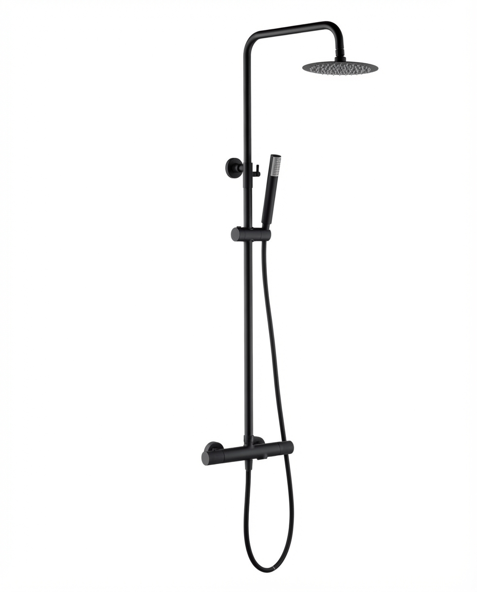 Kit de ducha de latón negro mate. Flexo metálico de 1,8m. negro mate. Soporte negro mate para mango de ducha de ABS. Mango de ducha negro mate redondo 3 posiciones (mod. Denver). Caudal medio 12 l/min. Cartucho cerámico de 35 mm.