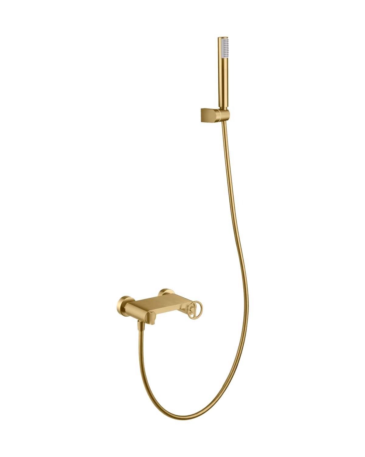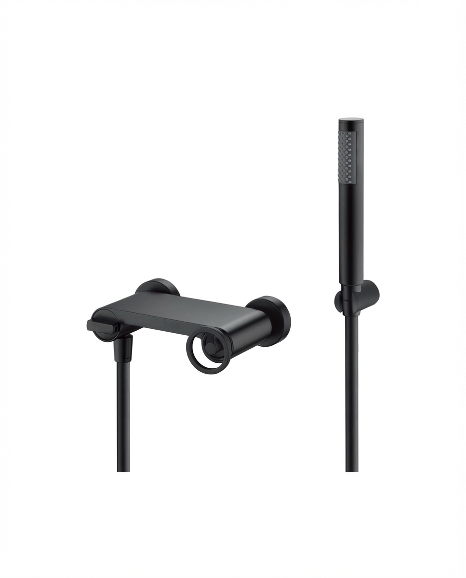 Kit ducha serie OLIMPO, cuerpo de grifería de latón, flexo PVC 180cm, soporte fijo para mango de ducha, mango ducha redondo, cartucho cerámico Ø35mm. Acabado cromo.