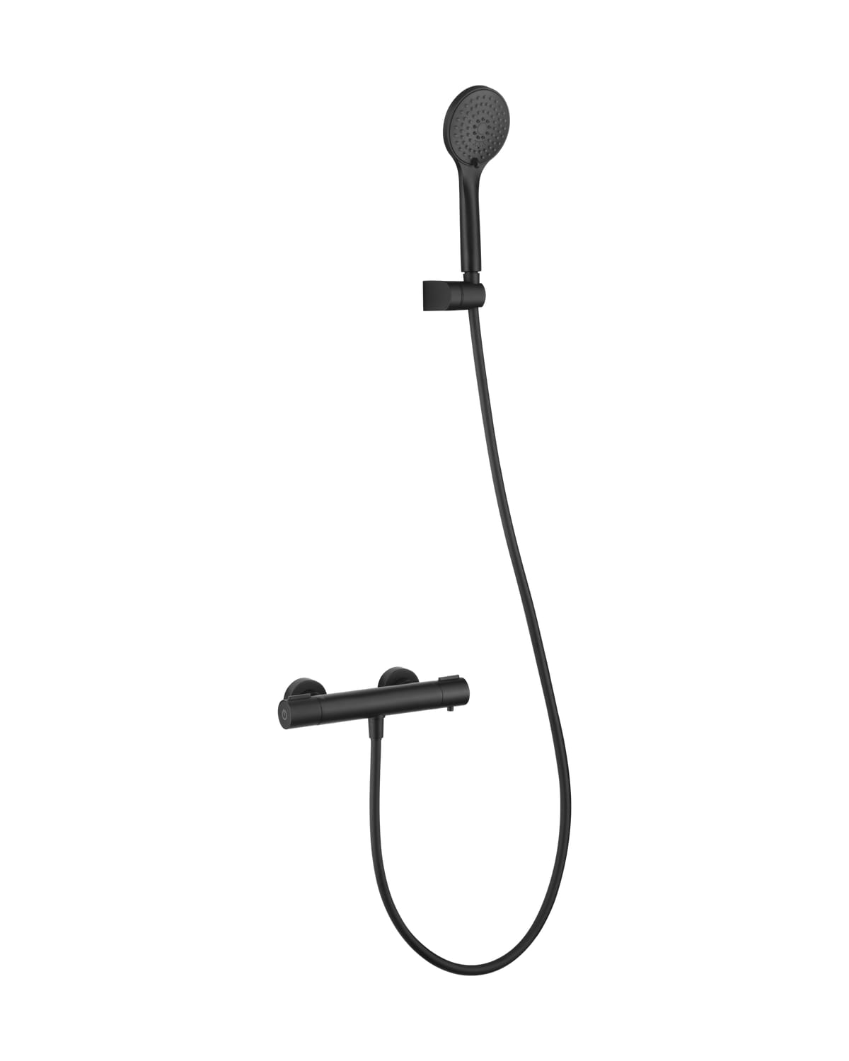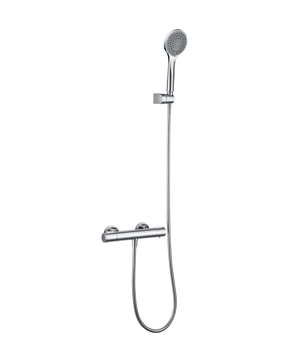 Kit ducha serie ECO-KENT, cuerpo de grifería de latón con sistema eco start/stop, flexo metálico 180cm, soporte para mango de ducha ABS, mango ducha redondo, cartucho termostátivo TURN CLEAN SYSTEM. Acabado cromo.