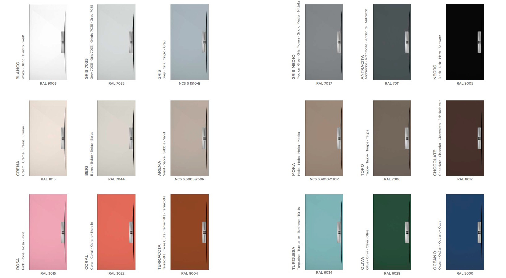 ANTRACITA ,ARENA ,BLANCO ,CHOCOLATE ,CREMA ,GRIS ,GRIS 7035 ,MOKA ,NEGRO |