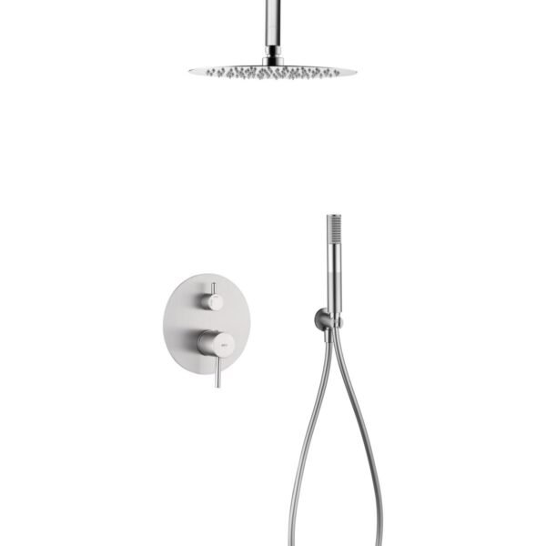 Empotrado de ducha serie MOSCU en acero s.,316, cuerpo de griferia 2 vías, rociador Ø25cm en acero s.316, cartucho monomando 35mm, brazo a pared en acero s.316, salida de agua en acero s.316 con flexo PVC y mango todo en acabado a juego. VALIDO PARA EXTERIOR