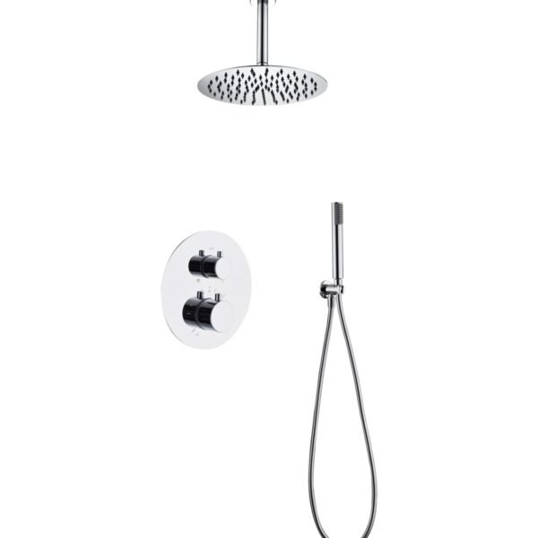 Empotrado de ducha serie TOP en acabado cromado, cuerpo de griferia 2 vías en latón cromado, rociador Ø25, flexo de PVC, cartucho monomando 35mm, salida de agua con flexo y mango y brazo a techo.