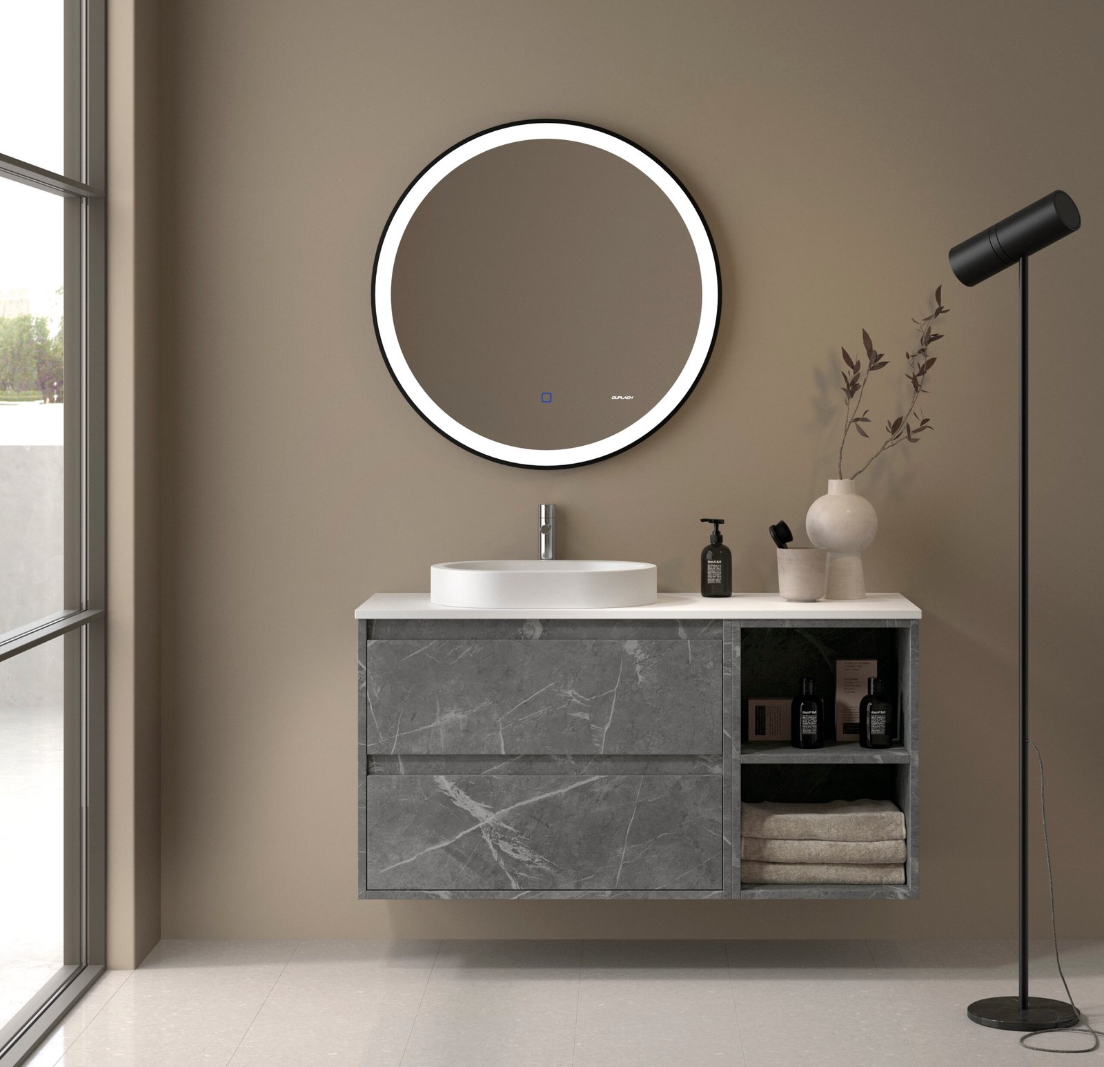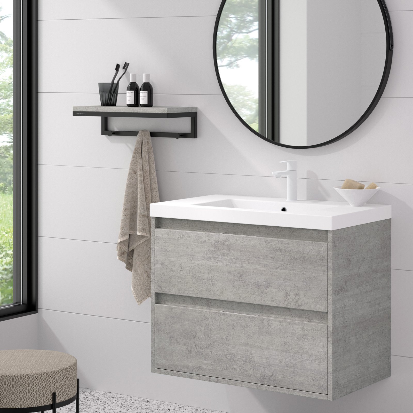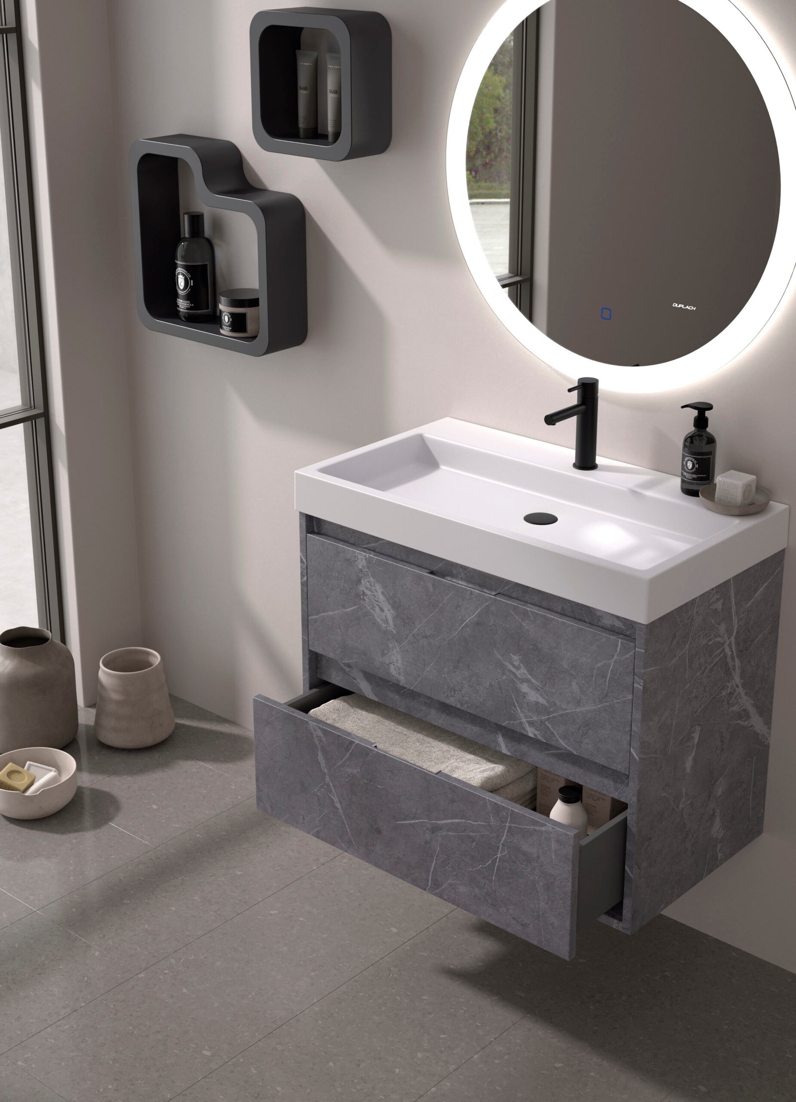 El mueble de baño ETNA destaca por su estética minimalista de líneas limpias y una calidad constructiva superior. Fabricado con melamina de alta densidad de 19 mm , garantiza una resistencia máxima y un tacto sedoso inigualable. Es la solución definitiva para quienes buscan un baño moderno, ordenado y duradero. Equipado con 2 cajones de gran capacidad , interior en elegante tono antracita y sistema salvasifón , es la solución perfecta para mantener el orden con estilo.