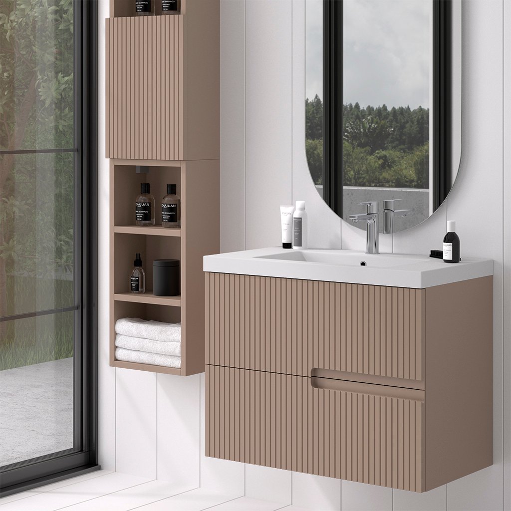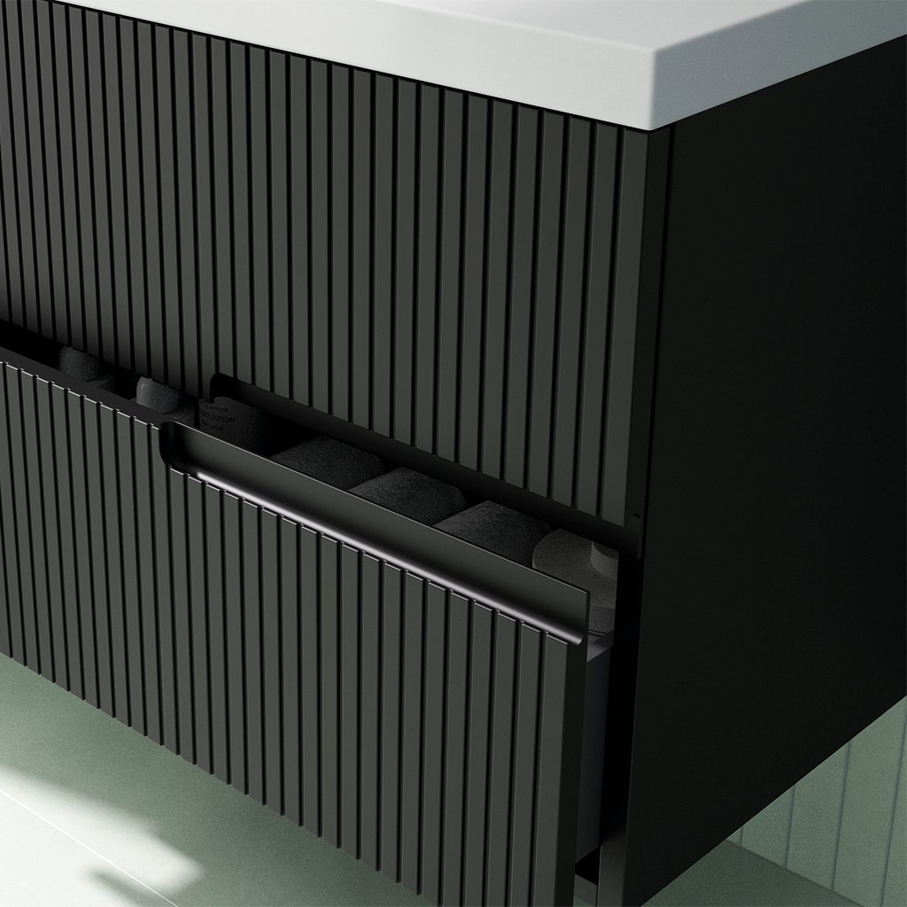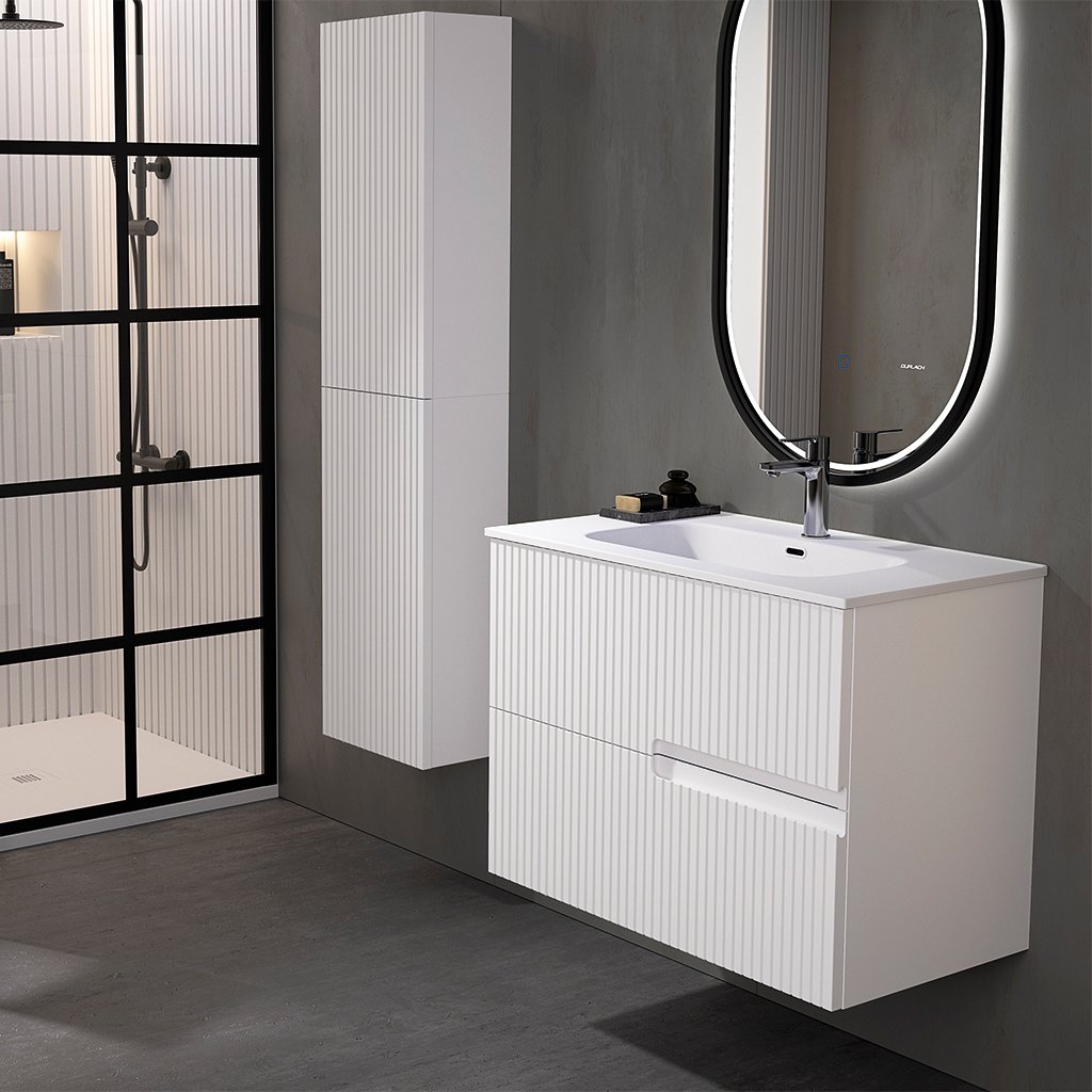 El mueble de baño MANA destaca por su diseño suspendido de líneas limpias y una calidad superior en sus acabados. Sus frentes están fabricados en MDF de 22 mm lacado por ambas caras , lo que garantiza una resistencia máxima y un tacto sedoso inigualable. Equipado con 2 cajones de gran capacidad , interior en elegante tono antracita y sistema salvasifón , es la solución perfecta para mantener el orden con estilo.